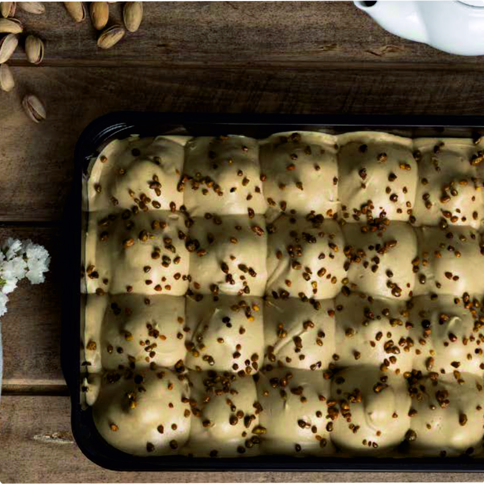 Choux-uri umplute cu frișcă Chantilly, acoperite cu cremă de fistic și decorate cu fistic mărunțit.